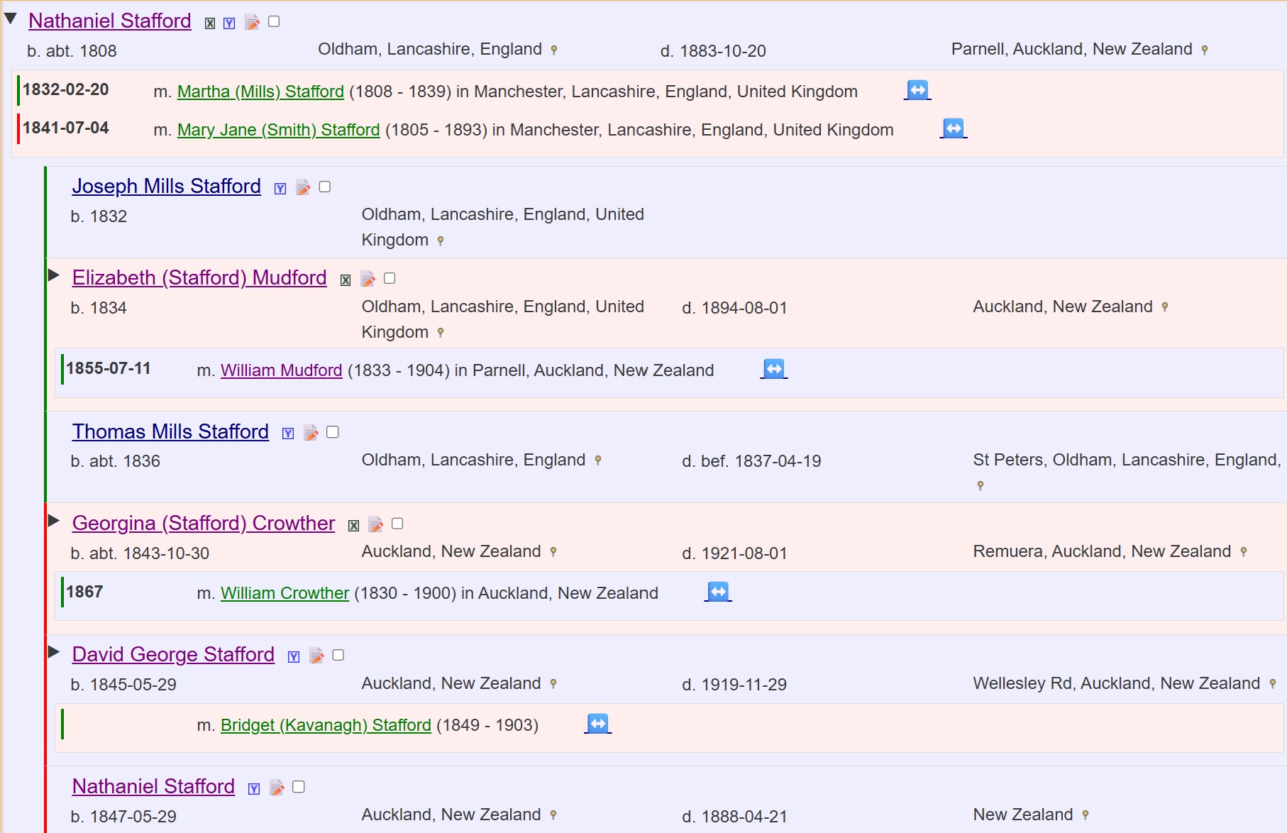 Nathaniel remarried later in 1841 to Mary Jane (Smith) Stafford. Nathaniel and Jane emigrated to Aotearoa with Elizabeth in 1842 on the Duchess of Argyle which sailed from Greenock, Scotland on 9 June 1842, and arrived in Auckland on 9 October 1842. It seems that the eldest son Joseph remained in England. However, he has not so far been found on any marriage, death or census records in England. Nathaniel and Jane had three children in New Zealand: Georgina (Stafford) Crowther, born in 1843, David George Stafford, born in 1845, and Nathaniel Stafford, born in 1847. Nathaniel died in 1888 apparently without marrying or having any children.