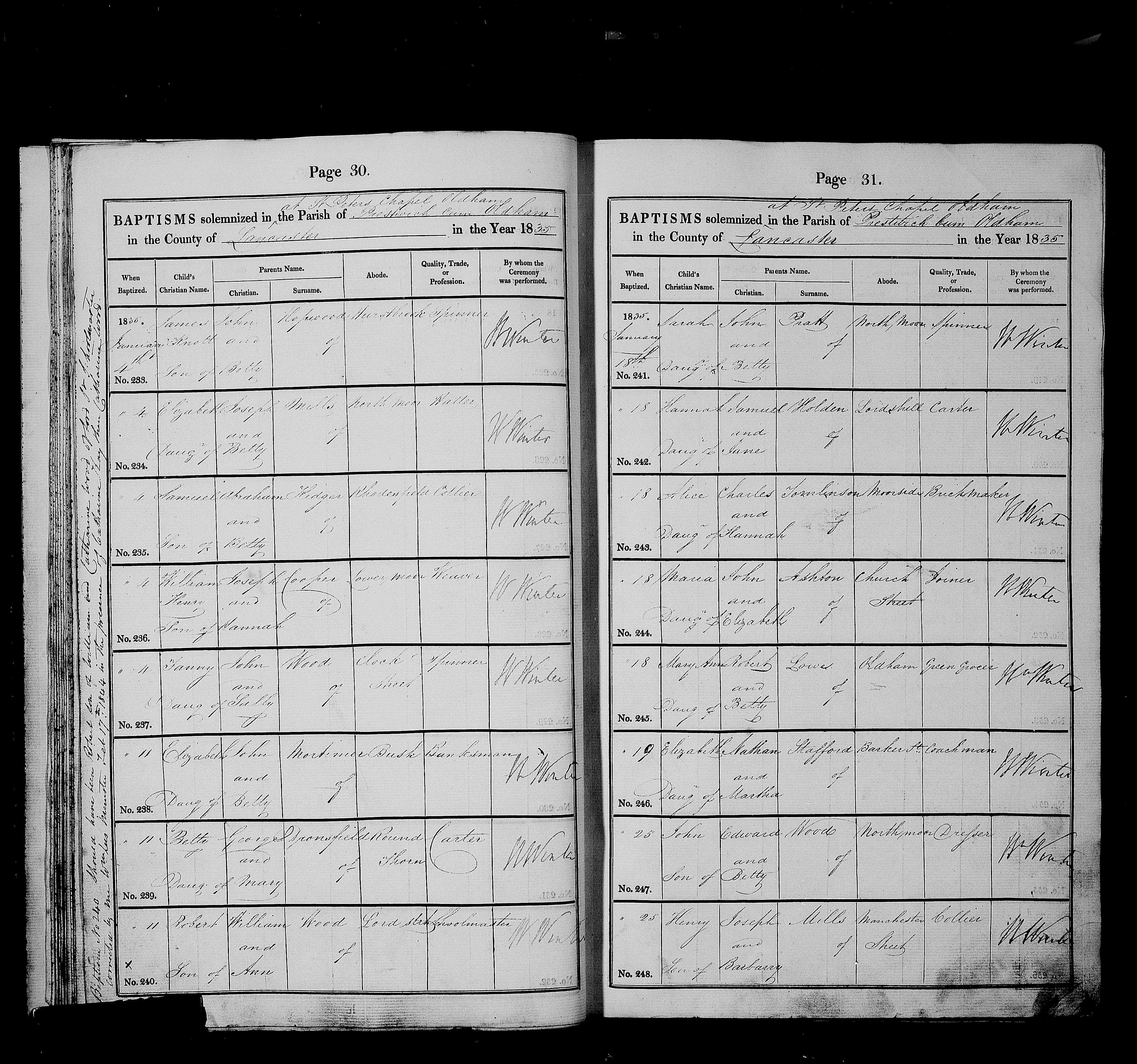 At the time of the 1841 England and Wales Census Elizabeth, aged 5, although actually 7, was living in Barker St., Oldham with her father Nathan (age 30), her brother Joseph (age 9) and Peter and Sarah Mills, age 23 and 25 respectively. It is likely that Peter and Sarah Mills were Nathan's brother-in-law and his wife.