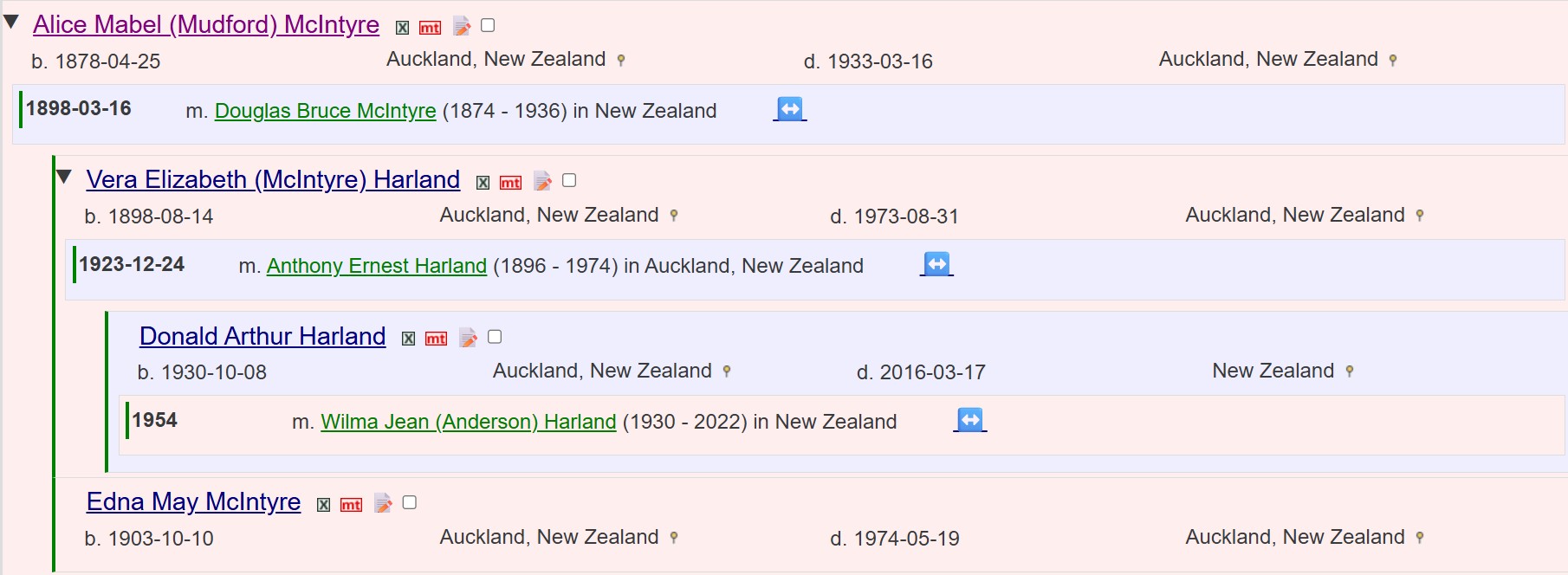 Alice Mabel (Mudford) McIntyre was born the 25'th April 1878 and died on 16'th March 1933 and is buried at Hillsborough Cemetery in Auckland.