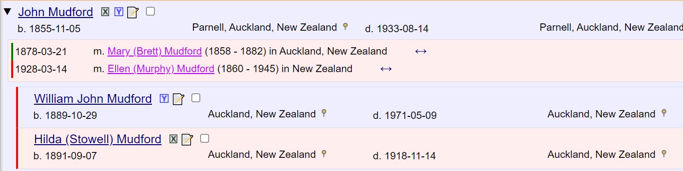 John married Ellen (Murphy) Stowell in 1928. However, they had been together for many years, possibly as many as forty since on John's death registration it was reported they had been married for 40 years. This is likely what Ellen reported at the time of his death. They had two children together John William Mudford who was born on the 29'th October, 1889, and Hilda (Stowell) Mudford, born 7 September 1891. John William's birth was not registered under the name Mudford until 1928, after his parents marriage had been registered. Hilda's birth was registered with a surname of Stowell, and no father. Hilda died in 1918 before her parents were married, however her death registration was under the name Mudford, and her death notice was under the name Mudford.